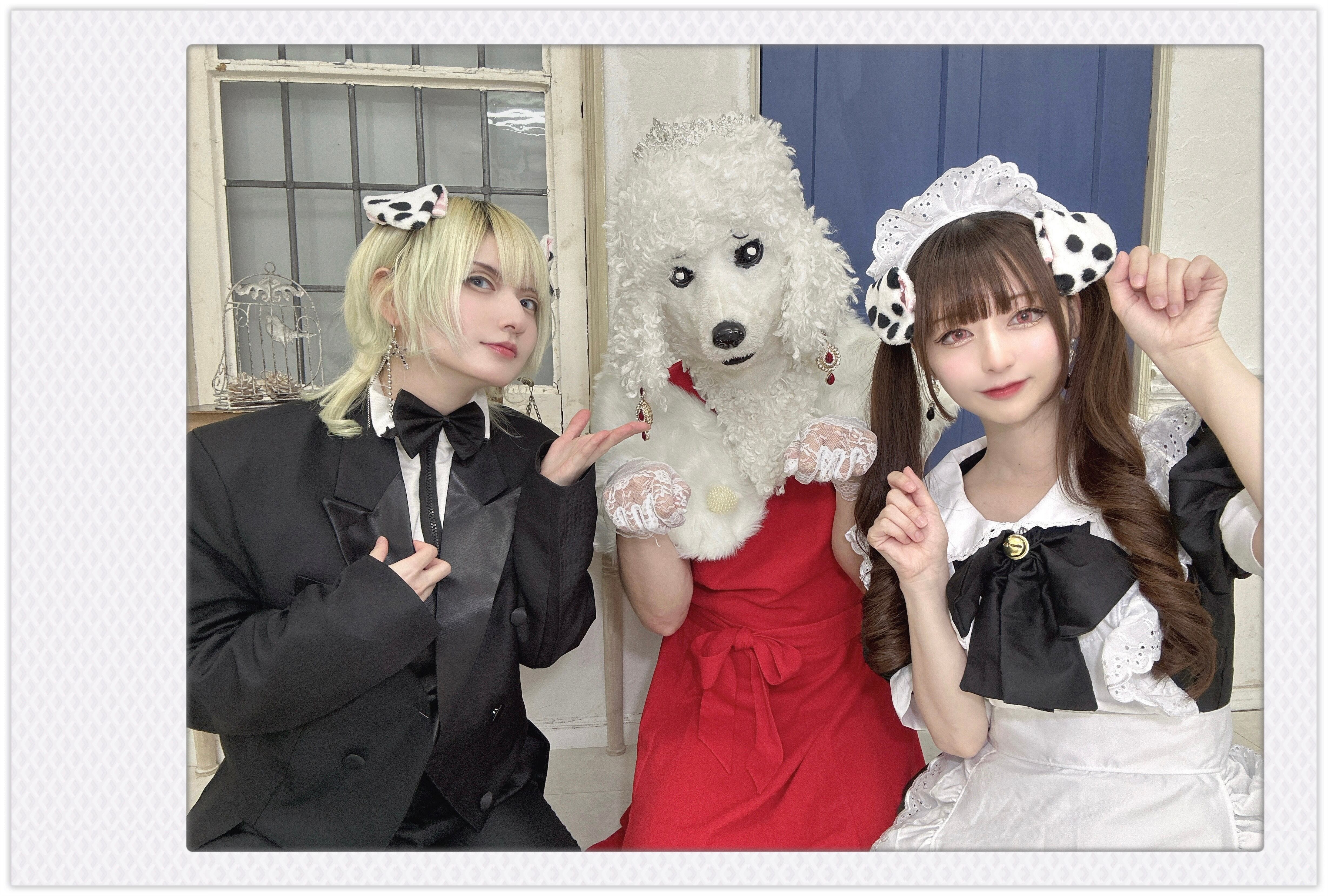 プードルちゃんお誕生日衣装(ドレスプードルちゃんとミラ執事としずりんメイド)を着た2人と1匹のランダムチェキです。